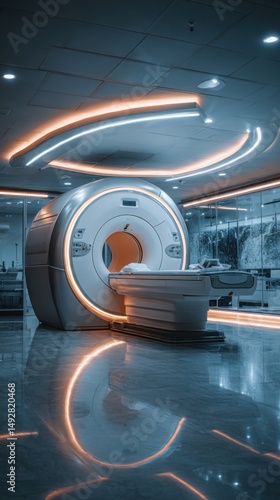 Modern MRI Machine in Hospital Room with Neon Lighting and Reflective Floors Medical Imaging Technology