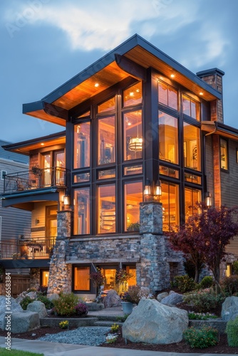 Modern, multi-level home at twilight, showcasing large windows and stone facade. Exterior lighting highlights the structure's design