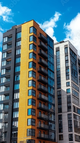 building, apartment, skyscraper, architecture, urban, city, modern, facades, window, balcony, exterior, residential, construction, design, brick, glasses, tower block, property, blue, sky, cloud, daylight, colours, yellow, black, grey