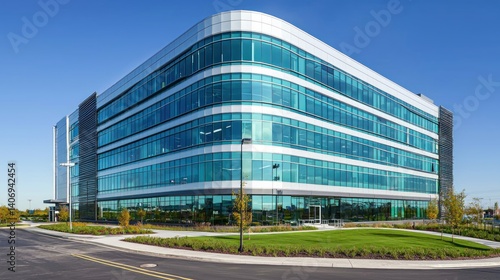 Modern office building exterior. Curved glass facade, sleek design, landscaped grounds, clear sky