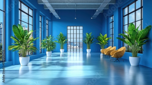 Modern office building interior with bright blue walls, large windows, and vibrant green plants creating a serene workspace atmosphere
