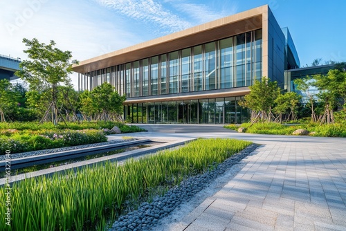 architecture, building, business, commercial, corporate, design, exterior, facades, glasses, green, landscape, modern, office, park, path, property, real estate, sky, structure, urban, water, paseo, window, yard, contemporary, stone, grass, pavement, lawn, garden, flower, duck pond, fountain, tree, plant, sunny, day, blue, bright, clean