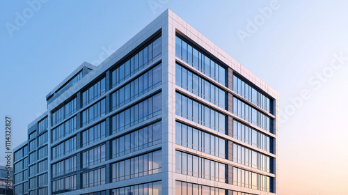 Modern office building with reflective glass windows against a clear sky, showcasing urban architectural design and structure.