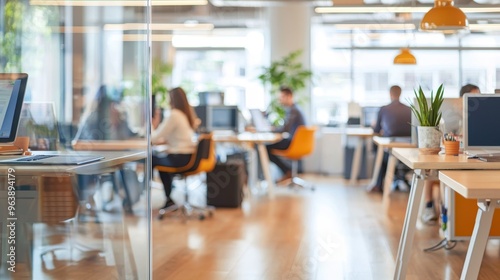 Modern Office Interior with Blurred Coworkers Glass Partition and Desk