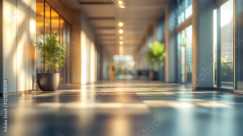 modern office interior with blurred perspective, featuring natural light, plants, and spacious corridor. atmosphere is calm and inviting, perfect for productivity