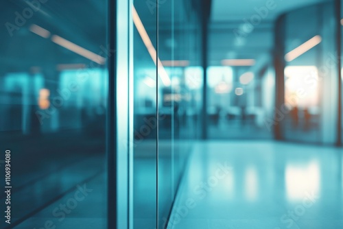 Modern Office Interior with Glass Walls and Reflective Surfaces, Showcasing a Clean, Minimalist Design in a Professional Workspace Environment