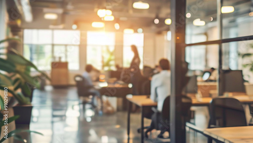 Modern office interior with glass walls. Blurred image of a contemporary office workspace with glass partitions, highlighting a bright and airy atmosphere.