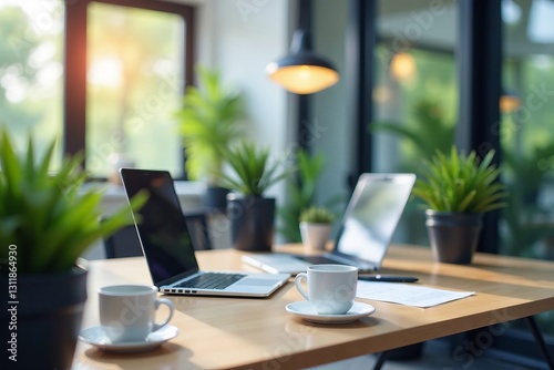 Modern office interior with laptops, plants, and coffee mugs, workspace, creativity
