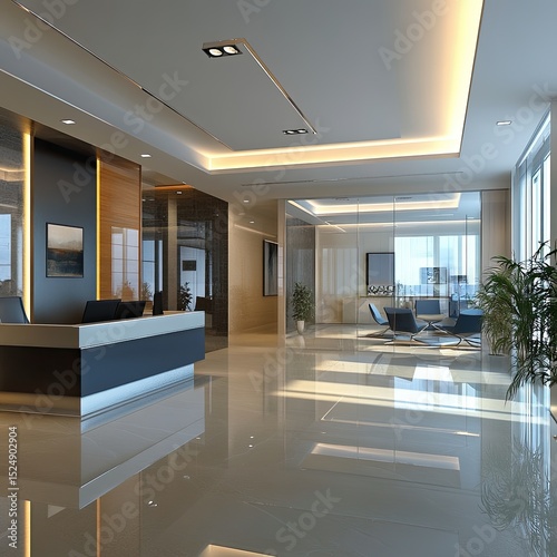 Modern office interior with sleek reception desk, glass partitions, and polished floors. Bright, spacious design