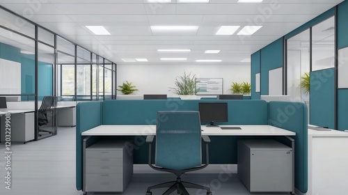 office, modern, interior, design, workspace, teal, desk, chair, contemporary, furniture, room, workplace, professional, business, corporate, commercial, building, architecture, interior design, space, environment, technology, computer, screen, plant, lighting, bright, clean, minimalist, efficient, comfortable, stylish, collaboration, teamwork, productivity, innovation, creativity, meeting, work, desk, chair, partition, light, plant, floor