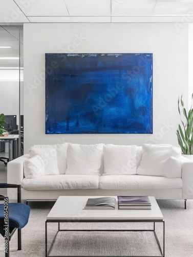 office, lounge, area, modern, contemporary, design, interior, white, sofa, cushion, pillow, abstract, art, painting, blue, deep, colours, wall, artwork, minimalist, simple, clean, line, texture, style, elegant, sophisticated, serene, calm, peaceful, quiet, space, room, floor, carpet, rug, table, hot drink, book, mag, plant, greenery, chair, comfortable