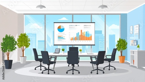 Modern Office Meeting Room with Chart Displays and Cityscape View in Bright, Open Environment Featuring Greenery and Furniture