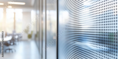 Modern Office Privacy Film: Abstract view of a modern office interior seen through a patterned privacy film on a glass partition. The film creates a textured effect.