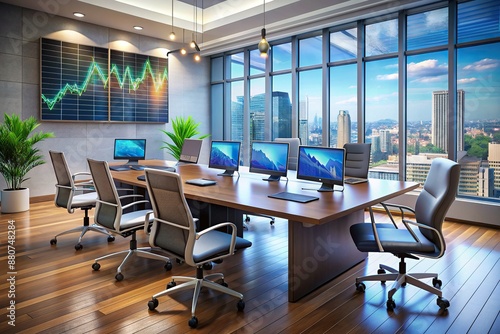 Modern office setting with sleek desk, ergonomic chairs, and large screen displaying financial charts and graphs, surrounded by laptops and notebooks