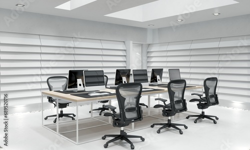 three-dimensional, room, chair, interior, empty, corporate, modern, desk, render, design, table, nobody, work, white, business, workplace, space, office, style, computer, copy, background, illustration, luxury, elegant, desktop, architecture, company, confident, executive, manager, monitor, open, blind