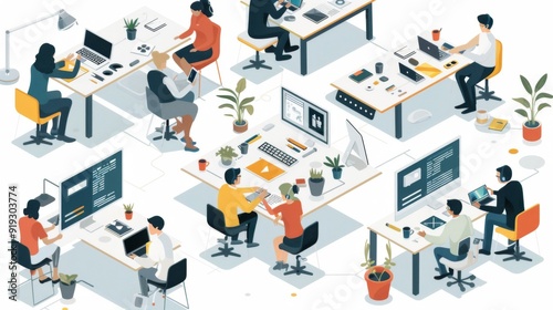 office, work, team, collaboration, modern, desk, computer, laptop, people, diversity, professional, technology, workspace, design, illustration, colourful, graphic, creative, business, meeting, project, communication, interaction, sharpened, productivity, innovation, solution, success, dynamic, efficient, organised, comfortable, bright, energetic, positive, optimistic, confident