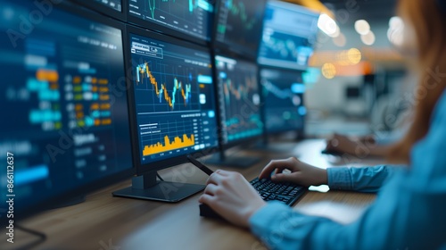 Modern Office with Financial Analyst Utilizing AI-Enhanced Financial Analysis on Multiple Monitors for Market Predictions
