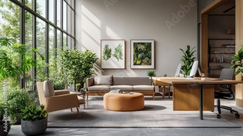 office, modern, interior, design, home, living, room, workspace, plant, furniture, decor, contemporary, comfortable, elegant, natural, light, bright, cosy, stylish, minimalist, wood, sofa, chair, table, computer, desk, green, tree, window, view, zen, calm, relaxing, professional, living room, inspiration, decorating