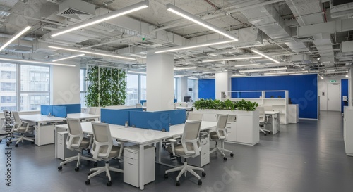 modern open office space, minimalist design, ergonomic chairs, white desks, blue accent walls, large windows, natural light, indoor plants