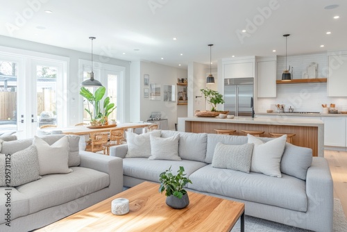 living room, kitchen, modern, home, interior, patio, natural light, house, sofa, dining, design, family room, decor, furniture, contemporary, cosy, bright, comfortable, warm, elegant, light, real estate, luxury, home decor, interior design, apartment, new construction, wooden floor, white, grey, plant, coffee table, family, open space