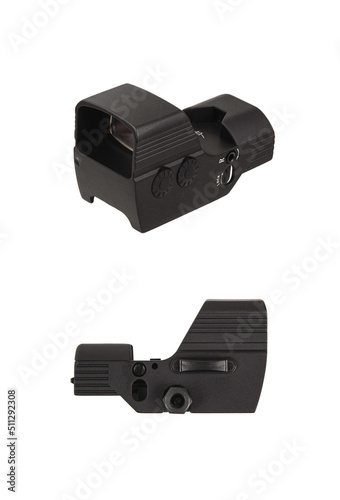 Modern optical collimator sight. Aiming device for shooting at short distances. Isolate on a white back.