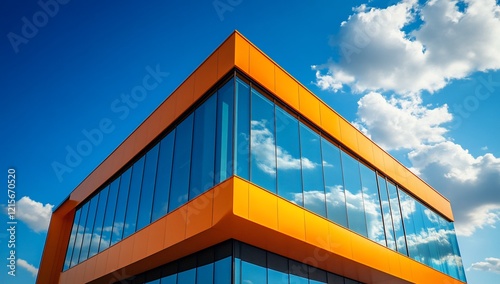 building, architecture, modern, glasses, office, sky, cloud, blue, orange, design, structure, contemporary, facades, urban, commercial, real estate, property, construction, exterior, window, sunlight, bright, day, summer, vibrant, colours, geometric, line, shape, corner, angle, elevation, view, scene, image, photo, picture, graphic, element, background, template, asset, material
