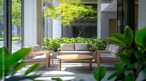 sun, light, green, nature, plant, tree, leaf, wood, furniture, sofa, chair, table, modern, design, interior, exterior, office, building, architecture, space, room, comfortable, relaxing, calm, serene, peaceful, quiet, tranquil, bright, sunny, day, garden, landscaping, greenery, environment, contemporary, style, elegance, luxury, aesthetic, ambience, atmosphere