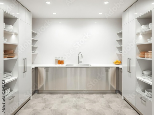 Modern pantry design featuring a sleek stainless steel bar and sink, stainless steel, cabinetry