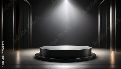 modern pedestal display illuminated by a spotlight in a dark room, creating a dramatic and elegant setting for showcasing