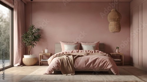 Modern Pink Scandinavian home interior design characterized by an elegant living room featuring a comfortable sofa, mid century furniture, cozy carpet, wooden floor, white walls, and home plants