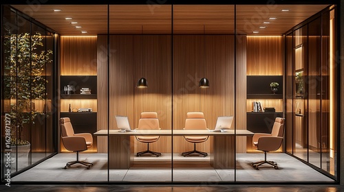 office, modern, private, conference, room, wooden, beige, chair, table, contemporary, design, interior, light, warm, elegant, sophisticated, minimalist, professional, business, meeting, space, furniture, decor, lighting, wood, neutral, calm, stylish, work, productivity, luxury, accommodation, corporate, executive
