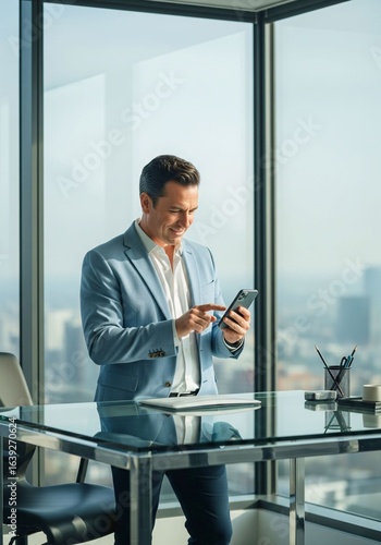 Modern Professional at Work: A focused individual, impeccably dressed in business attire, meticulously engages with his tablet, positioned at a sleek desk within a contemporary office space.