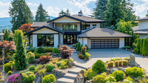 real, estate, house, property, modern, architecture, landscaping, garden, tree, scenic, home, driveway, window, yard, suppressing, attracted, residential, nature, luxury, design, exterior, sunny, greenery, leisure, calmness, location, investment, neighbourhood, lifestyle, front, porch, area, peaceful, mountain, view, open, space, colours, contemporary