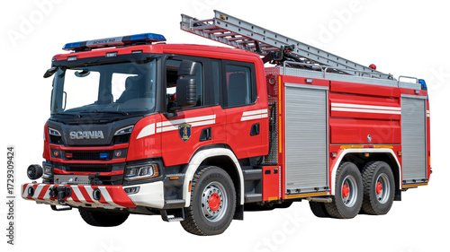 Modern red fire engine with extended ladder, ready for emergency rescue and firefighting operations, showcasing advanced equipment and safety features.