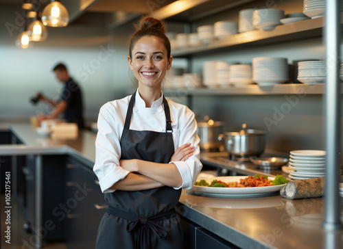 modern restaurant, kitchen, female chef, standing, smiling, food