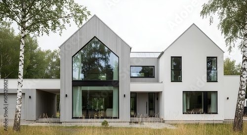 house, home, architecture, modern, contemporary, scandinavian, design, exterior, building, facades, window, glasses, minimalist, style, residential, property, real estate, grey, white, wood, siding, nature, landscape, yard, lawn, grass, tree, birch, sky, light, daylight, outdoors, lifestyle, family, living, urban, suburb, estate, construction, structure, architectural, residence, dwelling, housing, elevation, perspective, view, scene, environment