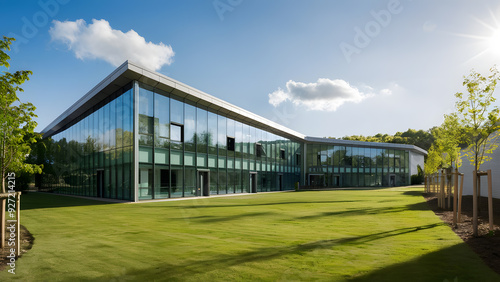 Modern School Building with Glass Facade on a Lush Green Lawn
