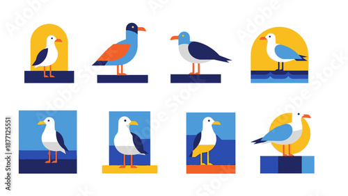 Modern Seagull Icon Set - Flat Design Vector Illustrations