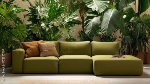 Modern sectional sofa in cozy living room, lush greenery surrounding, inviting and comfortable atmosphere, perfect for relaxation.