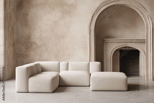 fireplace, arch, living room, interior design, cushion, ottoman, beige, stone wall, home decor, interior, sofa, room, furniture, home, couch, wall, living, design, house, chair, apartment, lamp, table, floor, decor, architecture, comfortable, contemporary, armchair, luxury, lounge, indoor, decoration, three-dimensional