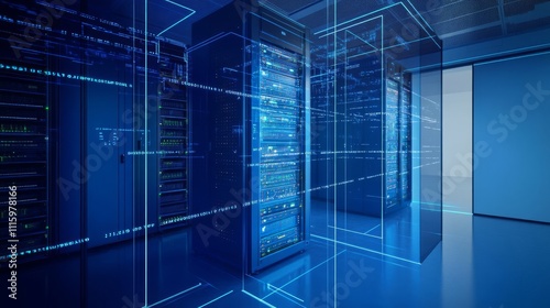 Modern server room with glass walls and blue lights. Big data technology concept.
