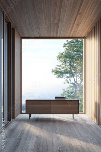 Modern sideboard next to a large window in a property interiors design composition inside a room with wall panels. Real Estate conceptual luxury image.