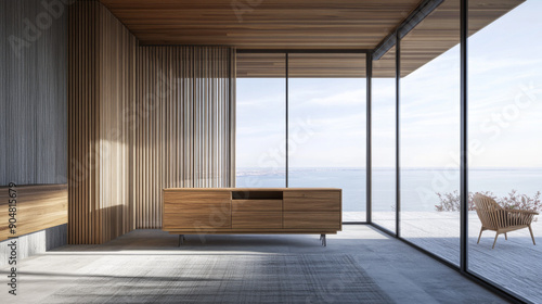 Modern sideboard next to a large window in a property interiors design composition inside a room with wall panels. Real Estate conceptual luxury image.