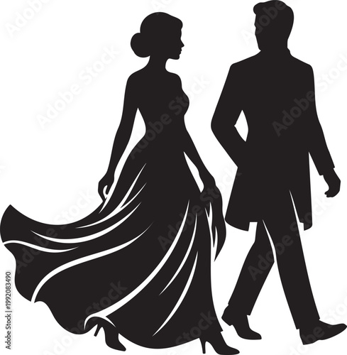 couple, walking, silhouette, fashion, stylish, lifestyle, dating, luxury, urban, romance, together, human relationships, man, woman, dress, suit, movement, modern, trend, advertising, vector, illustration, isolated, black, graphic, design, event, elegant, partner, activity, motion, sophistication, creative, minimal, high-end, contemporary, beauty