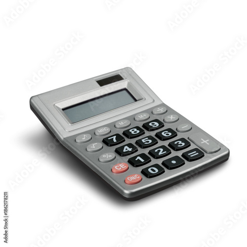 calculating machine, mathematic, finance, accounting, budget, tax, money, calculation, business, office, silver, grey, electronic, device, isolated, white background, buttons, screen, display, economy, counting, profit, cost, investment, tool, equipment, financial, inspecting, number, realistic