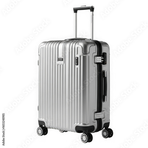 baggage, suitcase, travel, bag, wheeled, spinner, aluminium, metallic, silver, modern, contemporary, design, fashion, business, vacation, trip, aerodrome, transport, accessory, gear, carry, on, checked, baggage, handle, telescopic, 4, smooth, rolling, hard-wearing, lightweight, stylish, elegant, premium, luxury, isolated, object, cut-out, transparent, background, studio, shot, product, photo