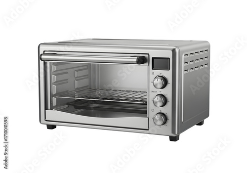 Modern silver toaster oven isolated on transparent background, perfect for baking, toasting, and warming food with its sleek design and convenient features