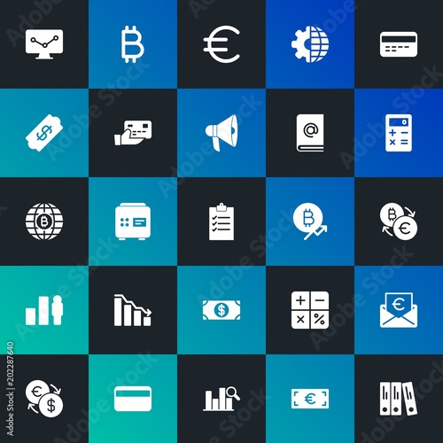 Modern Simple Set of business, money, charts Vector fill Icons. Contains such Icons as security, financial, research, plastic and more on dark and gradient background. Fully Editable. Pixel Perfect.