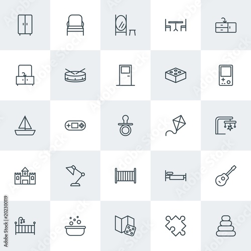Modern Simple Set of furniture, kids and toys Vector outline Icons. Contains such Icons as baby, musical, control, mirror, child, home and more on white background. Fully Editable. Pixel Perfect.