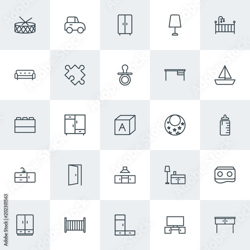 Modern Simple Set of furniture, kids and toys Vector outline Icons. Contains such Icons as nightstand, bed, night, work, virtual, toy and more on white background. Fully Editable. Pixel Perfect.
